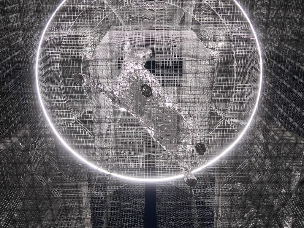Realizzata in rete elettrosaldata Cavatorta, materiale distintivo della sua poetica, l’opera si sviluppa all’interno di un parallelepipedo a base ottagonale in un gioco di volumi e trasparenze che evocano la leggerezza della luce e la sacralità dello spazio. L’Agnello è posizionate al centro trionfante e risorto, attraversato da un fascio di luce verticale, e protetto da uno spazio a forma di uovo, simbolo della vita oltre il sacrificio.